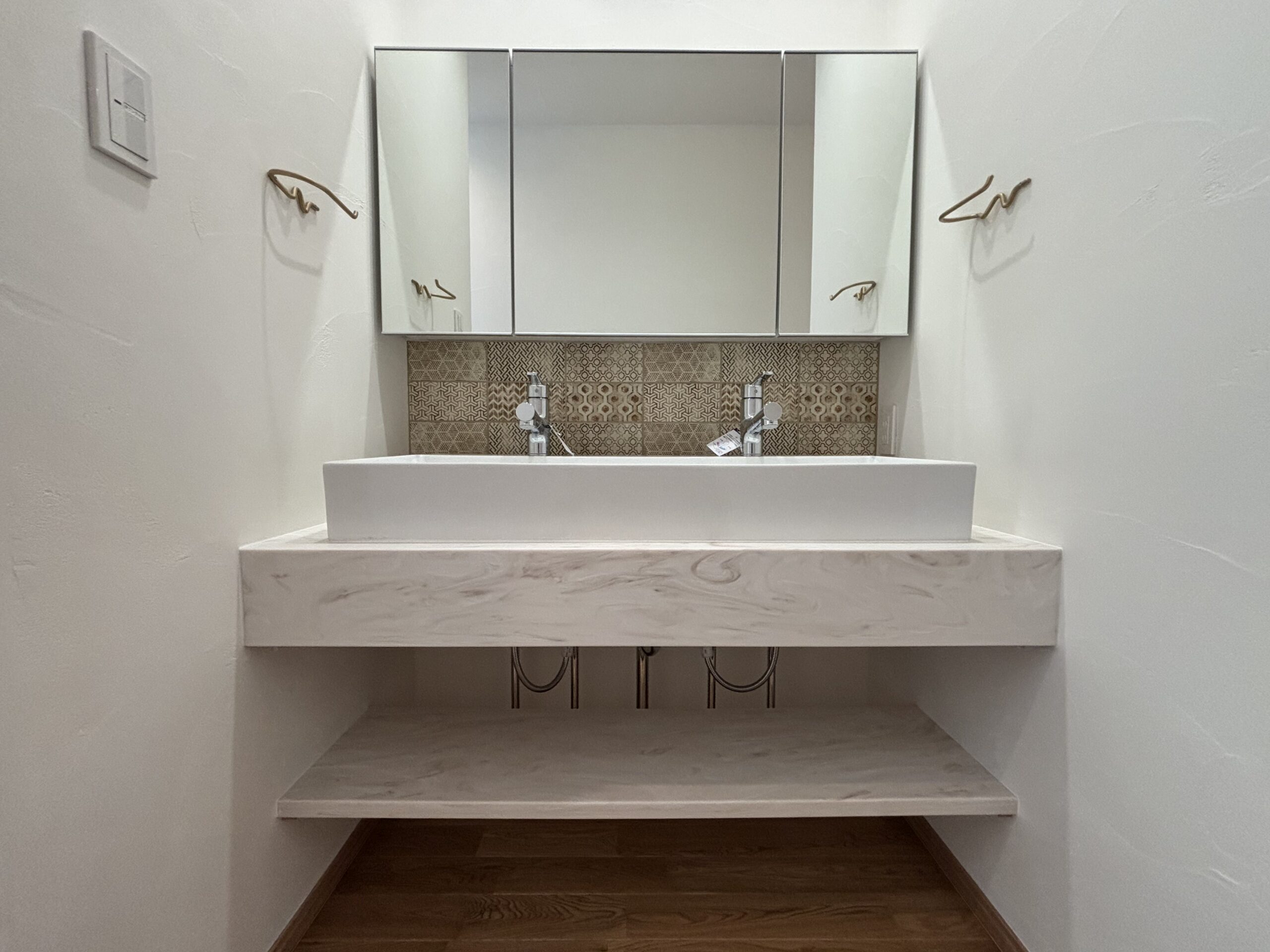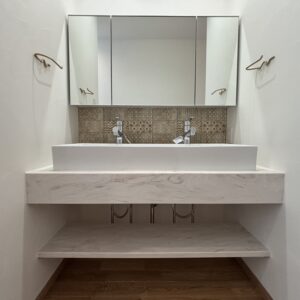 人工大理石で高級感溢れる洗面台に仕上がりました。